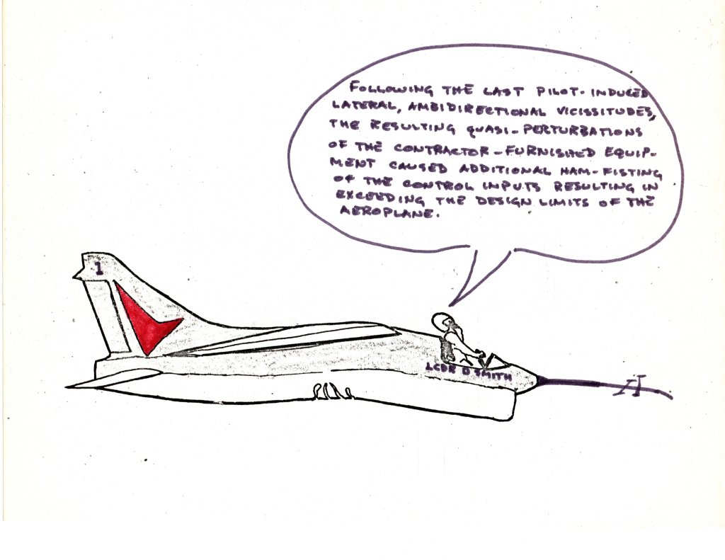 “Following the last pilot-induced lateral, ambidirectional vicissitudes, the resulting quasi-perturbations of the contractor-furnished equipment caused additional ham-fisting of the control inputs resulting in exceeding the design limits of the aero plane.”